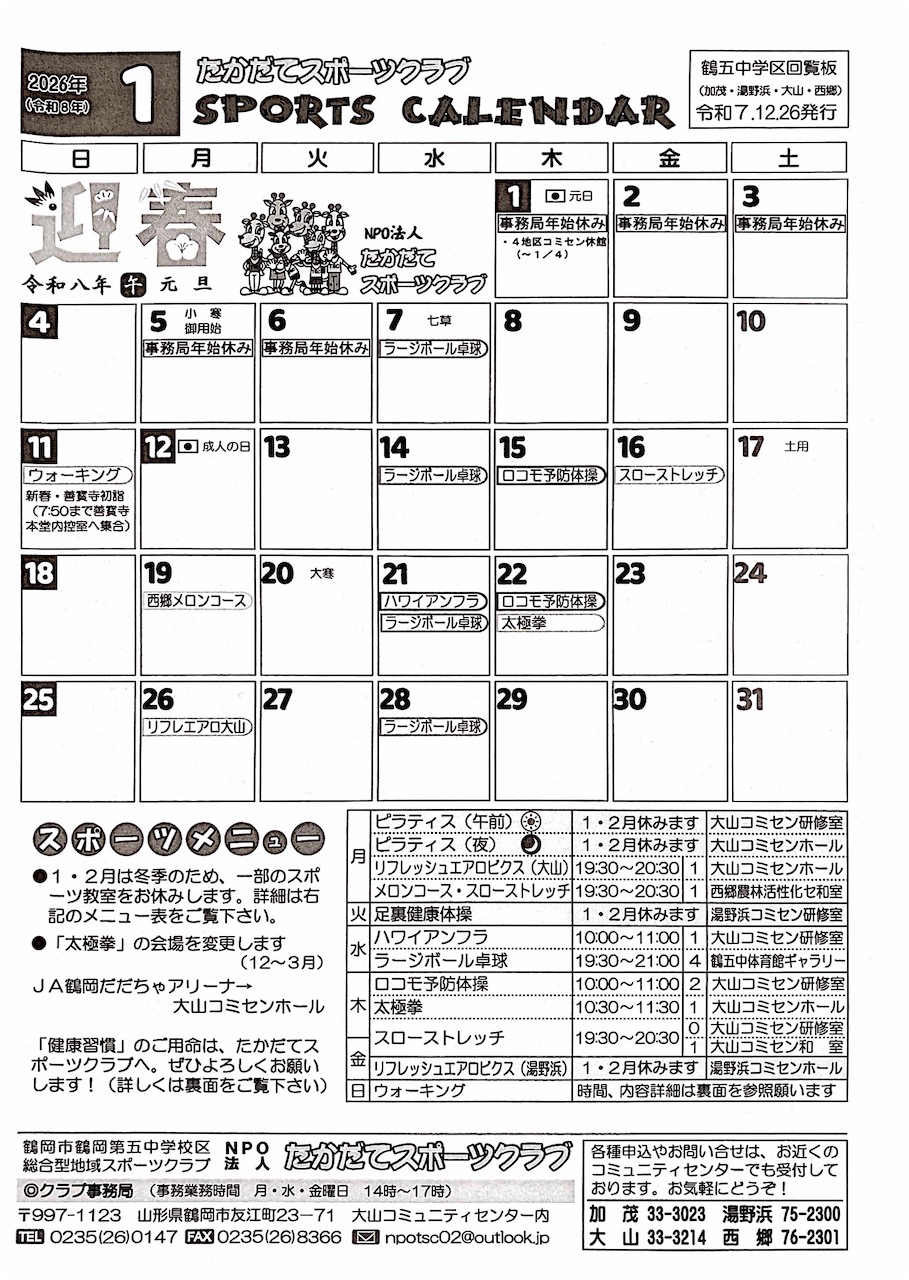 たかだてスポーツクラブカレンダー
